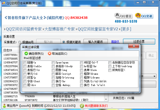 QQ空间日志采集器是智者软件推出的采集系列的首款软件,QQ空间日志采集工具可以根据关键词、QQ号两种方式进行采集QQ空间日志,并支持日志导出为TXT或HTM!