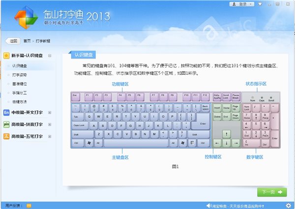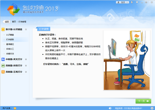 1、打开金山打字通2013,单击新手入门,选择打字常识,开始了解键盘区分布、打字姿势、基准键位、手指分工等基础知识并熟悉。