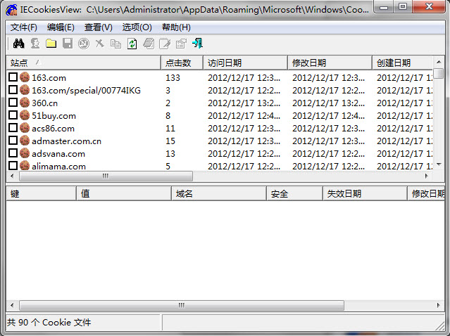 2、站点列表里是使用IE内核浏览器访问网站时所有曾留下cookie文件的域名,右侧可以看到详细的点击数、访问/修改/创建日期等等信息,然后鼠标上下点击选择相应的站点域名地址,在下方就可以显示出此域名下所有保存的cookie名称和值,右键就可以选择查看或编辑其内容。