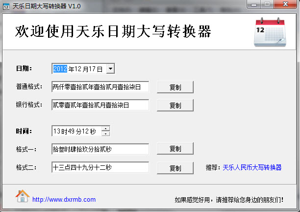 天乐日期大写转换器专业日期时间转换工具,绿色软件,不用安装,下载打开既能使用,不含插件等,转换准确,放心使用。感觉好用,请推荐给您身边的朋友们!