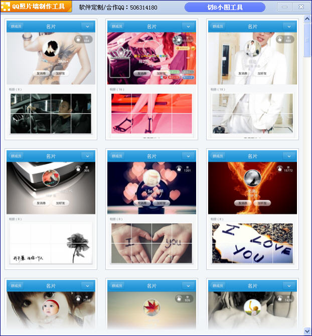 QQ名片照片墙专用制作工具 1.0 免费版 QQ名片照片墙专用制作工具是一款免费版的qq照片墙制作工具,该软件让你不再为了切割图片而去学习PS使用方法,轻松制作qq名片照片墙八组图。iPhone/安卓QQ照片墙制作并不复杂,下载这个qq照片墙制作工具几步搞定!解压缩后安装完软件即可使用。