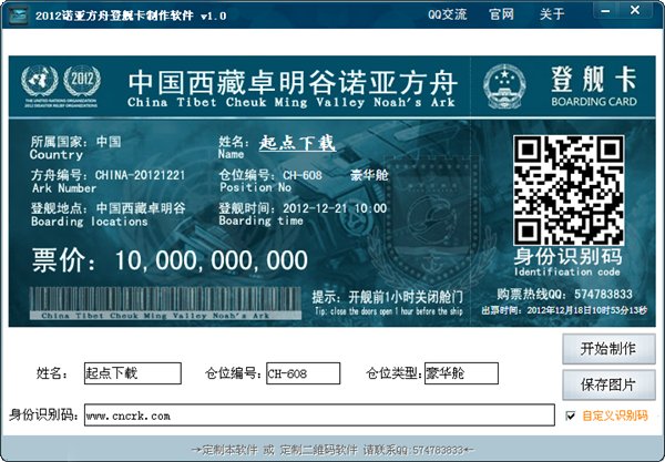 2012诺亚方舟船票制作软件帮大家制作出诺亚方舟的船票。2012“世界末日”啦,晚了就没有座位啦。诺亚方舟船票制作软件最大的特点是能生成带有身份识别二维码的船票,拥有独一无二的身份象征哦。