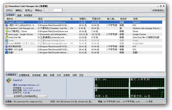 变色龙进程管理(Chameleon Task Manager Lite) 4.0.0.726.5 官方精简版 变色龙进程管理(Chameleon Task Manager Lite)是一个易于使用的工具,完全的控制你的进程,优化的计算机上运行的任务和电脑性能。