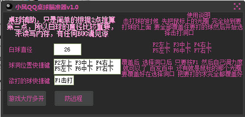 小风QQ桌球瞄准器:只是简单的根据2点推算第三点,所以白球的直径比较重要,未读写内存,有任何BUG请见谅!