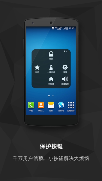 1、完全代理物理按键(锁屏、返回、菜单、音量键,全面帮你延长物理按键使用寿命,需ROOT支持)