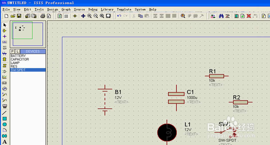 下面把元件从对象选择器中放置到图形编辑区中。用鼠标单击对象选择区中的某一元件名,把鼠标指针移动到图形编辑区,双击鼠标左键,元件即被放置到编辑区中。电阻要放置两次,因为本例中用到两个电阻。放置后的界面如图
