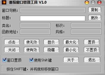 番茄窗口管理工具 V1.0 免费版 番茄窗口管理工具,用这个工具可以看出一个程序是用什么语言编写的,用这个工具查看程序的窗口或控件,如果窗口或控件的类名均以t开头,那有非常大的几率表明该软件就是用delphi或者c++ builder开发的,同时根据工具获得的控件类名,你还可以知道该软件使用了什么第三方组件。另外,工具还集成了按钮可用或禁用功能,可以使被禁用的按钮或控件变为可用。