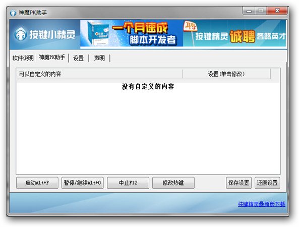神魔pk助手 V1.0 绿色版 神魔仙界pk助手(神魔仙界辅助)说明:神魔仙界好玩。但在野外和帮派据点战是,不能自动PK,要人手按键盘,累死了。 神魔仙界PK助手就是帮你解决这个问题。 PK助手不停的按1~7键。你可以根据自己的喜好来编排技能。自己只要换人或者点人就行了,至少左手能不累呀,呵呵