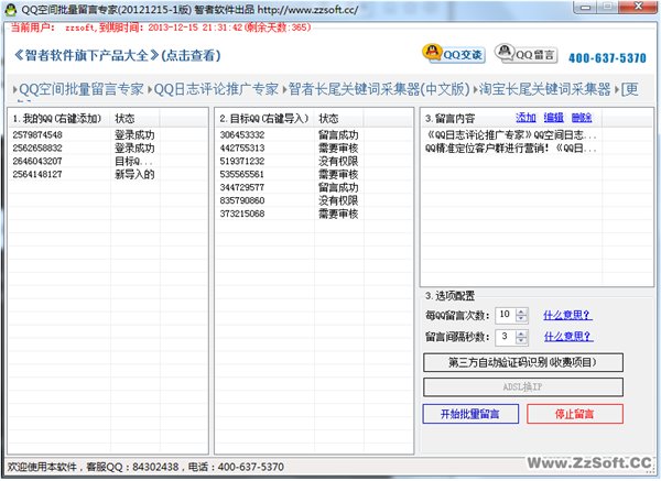 QQ空间批量留言专家是智者软件推出的一款针对QQ空间进行批量留言以达到广告宣传群发的目的!具有精准定位客户群进行营销的特性!支持QQ记录状态(第一次登录后会把登录状态保存下来,下次直接评论不再登录,避免QQ频繁登录被封),只需登录一次!同时支持第三方验证码全自动识别登录QQ!支持多条信息随机抽取评论,支持外部导入QQ号直接批量留言!