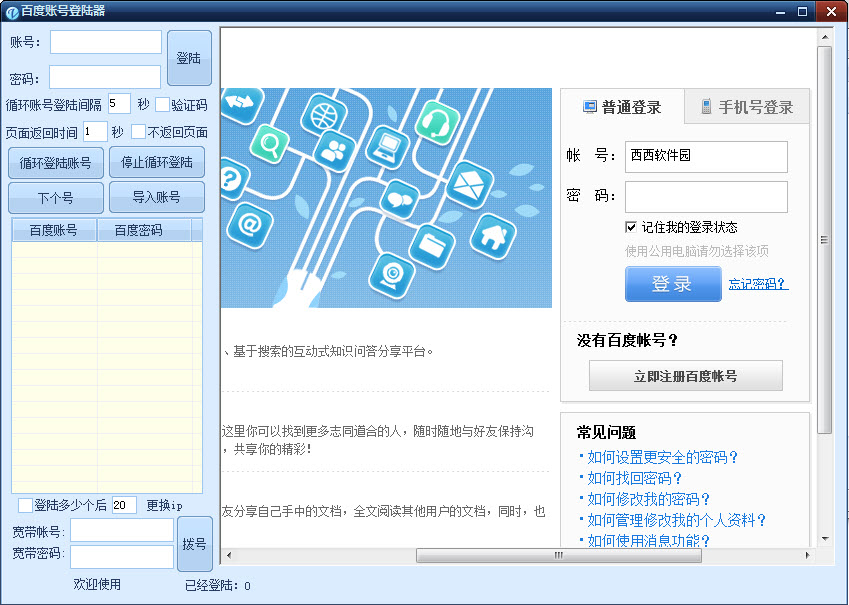 百度账号登陆器:可循环登陆大量的百度账号,可自动换ip,适合于做百度知道的,而且是永久免费