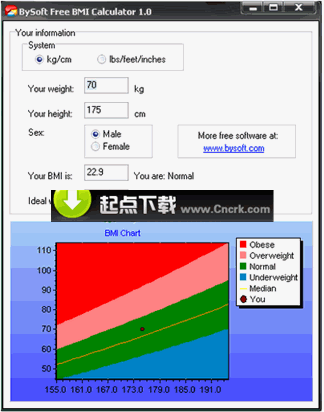 BySoft Free BMI Calculator 可以帮助您轻松地计算体重指数。只需要输入您的身高,体重和性别,BMI Calculator 就会显示出您属于何种体形与您的理想体重,并且它会给出一张动态体重指数图表。