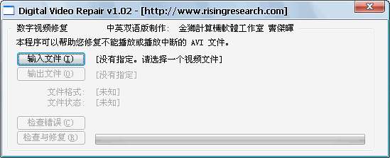 Digital Video Repair(AVI修复工具) V1.02 绿色汉化版 Digital Video Repair 是一款修复AVI文件的免费工具。它可以帮助您修复下载后不能正常播放、视频播放异常中断、视频无法定位或根本无法播放的AVI 文件。 为了使用方便,特别将软件最新版进行了汉化处理,并制作成中英双语版以方便不同类型的用户使用。