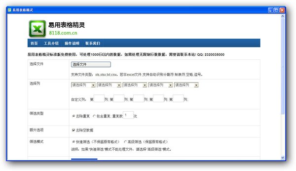 易用表格精灵是一个表格数据处理工具,一键去除excel(xls、xlsx、csv)、txt、制表符等文件中的重复数据和空数据并生成处理后的新表格,方便快捷。 可用于处理电话名单、学生报名表、财务报表等批量数据表中的重复数据,一键去除excel(xls、xlsx、csv)、txt、制表符等文件中的重复数据和空数据并生成处理后的新表格,准确率100%,方便快捷。