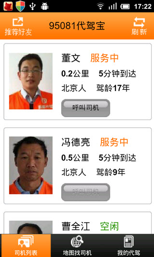 95081代驾宝,开车赴宴,盛情难却下,应酬难免喝酒。难道打的回去?nonono,掏出手机请代驾!当前最火爆的手机代驾软件,有车一族的手机必备代驾工具。精准定位,就近直接呼叫代驾司机。规范的代驾服务,为您省钱,为您的安全护航。地图精准定位,可以找到离您最近的代驾司机。查看所有代驾司机的详细个人联系方式与个人资料,95081严格为您把关。客户直接呼叫,在约定的时间内提供规范的服务,并可签署代驾合约。全国最优惠,本地收费最低,性价比优于打车,没有附加,没有压力!