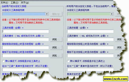 本软件可方便管理IE自定义工具按钮,可添加、修改、删除自定义的IE工具按钮和菜单,并且可按照需要分别作用于当前用户的IE或所有用户的IE