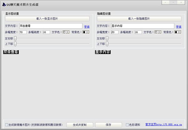 QQ聊天魔术图片生成器还可以在图片上添加文字,并调整文字位置,一键生成并复制,直接就可以粘贴在聊天窗口中!还可以保存到电脑中!软件还支持生成新浪微博和腾讯微博魔术图片的功能!把魔术图片发到微博中有同样的效果!