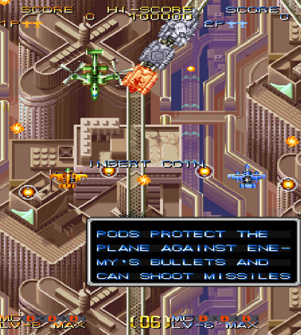 威虎战机CAPCOM的每个飞机游戏都会有些与众不同的地方,这个游戏也不例外! 首先,有两种机型可选,一种是保护球在四周环绕的,一种是保护球一直在前方吸收子弹,显然对于这种纵版游戏来说,后者是更好的;最特别的地方是在于这个游戏的炸弹是可以蓄的,就是说你放完三个保险后,保险又会慢慢蓄满,这样又可以入炸弹了,如果打得好的话,就等于有无数个保险了。