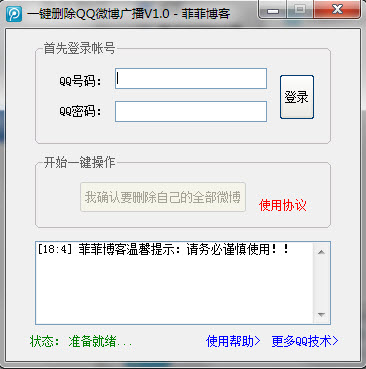 1、下载并打开附件中的腾讯微博删除工具,登录你想要删除微博广播的QQ号码。PS:看到介个界面有木有很熟悉的感觉呢,哈哈!没错,这是菲菲博客为庆双旦(圣诞or元旦)特意为各位需要的朋友准备的三连弹软件作品(删说说、清留言和删微博),希望大家喜欢!