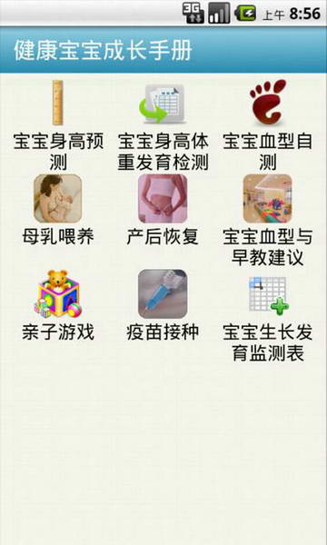发育指南;宝宝身高体重检测;宝宝血型;母乳喂养;产后恢复;亲子游戏;疫苗接种说明;宝宝发育监测表;宝宝辅食等。【成长手册软件更新】