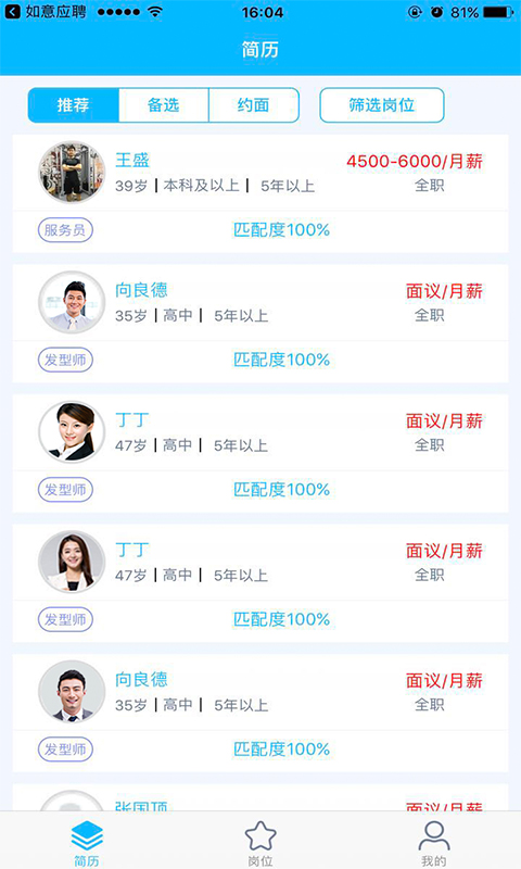 如意招聘app是一款专门解决企业HR招人难的手机招聘软件,该软件聚集各类人才信息,HR用户可以通过它精准匹配目标求职者简历信息,从而快速招到合适的人才,提升企业招聘员工的效率。