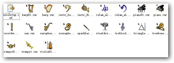 西洋乐器钢琴小号主题鼠标指针,以为西方的音乐乐器为图标的鼠标指针主题,包括钢琴,竖琴,小号,架子鼓,萨克斯,三角,大号,长笛等西方经典乐器.喜欢古典音乐的朋友们不要错过哦!