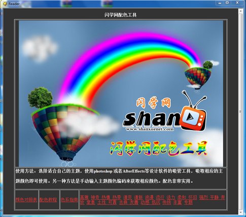 闪学网配色工具 1.0免费下载 为方便平面设计与影视后期制作人员颜色配色与调色,闪学网制作了颜色配色工具,简单易用。