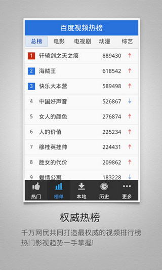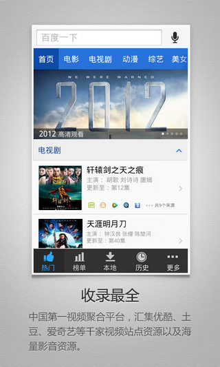 手机百度影音安卓版汇集了全网视频资源,包含优酷、土豆、搜狐视频、爱奇艺、凤凰视频、新浪视频、乐视网、 腾讯视频等千家站点资源。