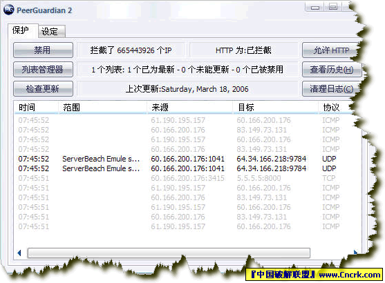 好在总有人比我们想的周到,PeerGuardian 便是一款口碑很好的、颇具代表性的 P2P 网络安全软件+ P2P 下载优化工具,初版发布时可以说是具备填补市场空白意义的,用国外网友的话说就是“将网络安全防护深入到了用户的指甲缝里”。PeerGuardian 是凤凰实验室(http://phoenixlabs.org/)开发的完全免费、开放源码主打安全产品,专为 P2P 用户及其它对信息安全有需求的用户设计。它基于包过滤特性提供针对 P2P 传输的防护,在保障安全的同时还可通过阻止并记录国际上几乎所有的 P2P 封杀机构(Anti-P2P: 如 RIAA, MPAA, MediaForce, MediaDefender, BaySTP, Ranger, OverPeer, NetPD 等等)对您的爱机进行探测/连接,从而避免隐私外泄。且理论上您无需手动对这些机构进行屏蔽,PeerGuardian 将按照您的设定定时自官方网站下载包含被广大 P2P 爱好者认为理当屏蔽的“州官机构”的列表数据库:) PeerGuardian 支持对几乎所有基于 TCP/IP 协议衍生的 P2P 文件共享软件进行协防和优化,如 Kazaa, iMesh, LimeWire, eMule, Grokster, DC++, Shareaza 等等...
