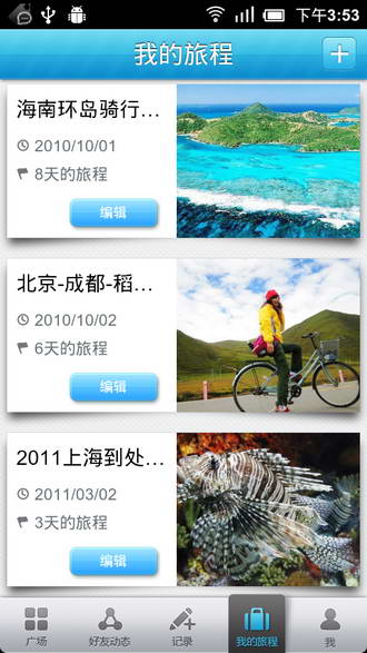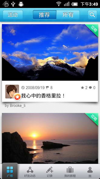 从“广场”看看大家都去哪里玩了,有那些美丽的旅程出现。关注旅游达人和你的朋友们,看看他们去哪里了,有什么好玩的事情在旅途中发生,一路上有什么美景。