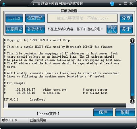 一键广告过滤 V2.0 绿色版 一键广告过滤是一个用来过滤广告、屏蔽恶意网站和谷歌转向的软件。