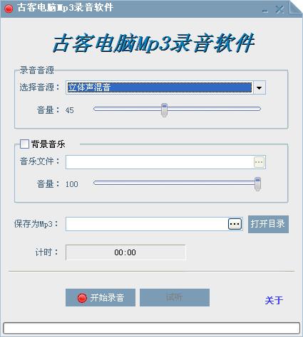 古客电脑Mp3录音软件是完全免费的录音软件,无录音时间限制,自动保存为Mp3文件,无需再次压缩。可调节录音音量,如麦克风话筒音量等。支持同时录制背景音乐,用它来录制自己的卡拉OK、翻唱歌曲非常方便。