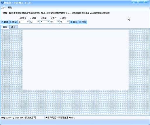 莽荒纪字符画王下载 V1.0绿色版 莽荒纪字符画王是一款创建特殊字符功能的程序,程序简单易用,可以自动设定,也可以自己画出特殊字符。提醒:鼠标中键滚动可以改变笔的字符;按alt+f可解除鼠标的锁定;alt+s可以重新开始画;alt+d可复制到剪粘板。莽荒纪字符画王完美实现特殊字符的创建功能。