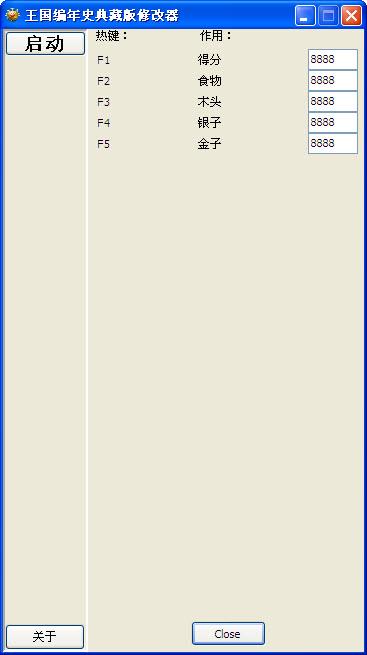 F1 得分修改 F2 食物数量修改 F3 木头数量修改 F4 银子数量增加 F5 金子无限
