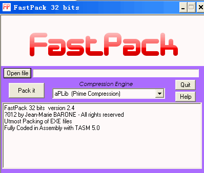 FastPack打包和压缩EXE 内部加载程序文件。文件压缩使用的 Lempel-ziv 算法,通用无损数据压缩协议。当将运行已处理的文件时,加载程序将执行减压、 释放所包括的项目。