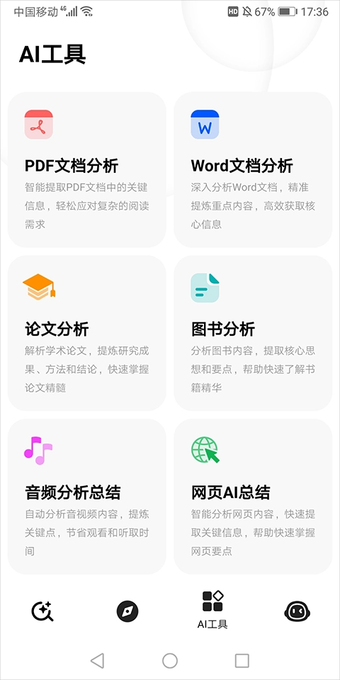 5、进入“AI工具”页面,该页面包含论文分析、图书分析、音频分析等内容。