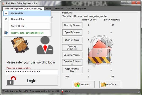 R.W. Flash Drive Explorer(U盘文件管理器) V1.0 官方版 RW闪存驱动器资源管理器是一个有用的应用程序,它的目的是为了为您提供自动组织一个便携式USB驱动器上的文件的一种手段。该方案有几个默认的类别中,文件都放在我的图片,我的视频,我的音乐,我的文档,我的文档,我的软件,我的其他文件。