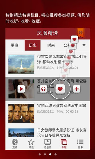 精选凤凰台独家节目完整视频,例如:锵锵三人行、一虎一席谈等金牌栏目,支持热词搜索,全方位诠释手机新媒体