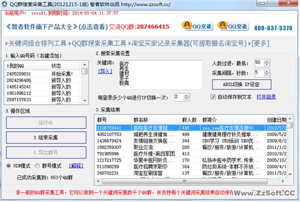 智者QQ群搜索采集工具 V2 20150703 免费版 智者Q群搜索采集工具是一款功能强大的QQ群搜索采集器,该软件支持关键词搜索QQ群,自动保存QQ群,ADSL切换IP,多帐号多关键词自动登录采集,支持UIN和群号两种模式等功能,一个关键词最少可采集数千个QQ群,非常适合挂机自动采集。