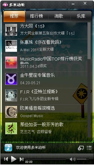 多米动听和多米音乐不同,该软件主要是向你推歌,而多米音乐主要还是搜歌。当你不知道要听什么歌时,可以试试这个软件,多米热歌推荐、多米排行榜,帮你找到时下最流行的歌曲,让听音乐变得如此简单。