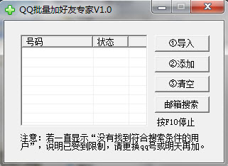 QQ批量加好友专家 V1.0 绿色版 QQ批量加好友专家是一款qq批量加好友软件,可以批量导入,批量添加QQ好友,加QQ好友利器,更换QQ号码或QQ被盗qQQ好友就没了,所以用“导出QQ好友工具”把QQ好友做个备份,然后再用本软件批量添加,这样QQ好友又回来了,从此不怕QQ好友丢失了!