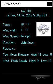 这些信息包括温度,风寒,风速,天气状况和预测未来两天气候。您可以从“选项”窗口中设置的位置和刷新的时间间隔。你会在你的桌面屏幕,可以查看天气预报!