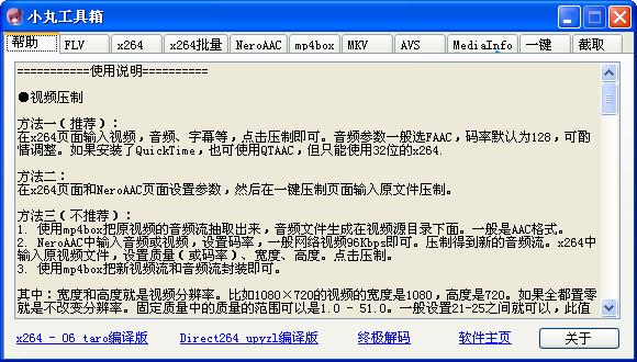 小丸工具箱是一款可以压制H264+AAC视频的图形界面工具,内核是x264、neroaac、mp4box等开源软件,属于傻瓜型压制工具