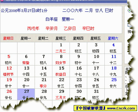 软件包括阳历、阴历、闰年、闰月、各种节日、节气(准确的交节时间)、天干地支(四柱八字)、属相、星座、星期、传统黄道吉日(黄色)的显示以及每日宜忌提示等