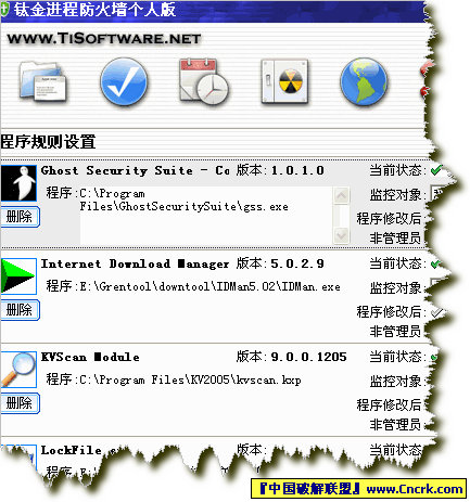 钛金进程防火墙个人版 1.2 Build 1.2.0.1 绿色特别版 黑客、木马、病毒的活动都会在注册表和进程中有所表现。钛金进程防火墙是监控进程是否有异常现象的防火墙。网络防火墙、注册表防火墙、进程防火墙“三墙合一”是当前上网冲浪的最佳组合。