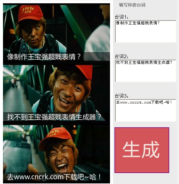 王宝强超贱表情生成器只要打上自已喜欢的台词的加上配上王宝强的超贱表情然后点击生成就可以啦。不用再担心因为photoshop没学好而不会处理图片啦。