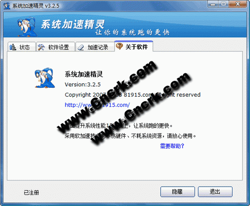 系统加速精灵 V3.27 简体中文绿色特别版 让您的系统跑的更快,适合各种配置机型使用,一般可使系统运行速度提高15%-30%。对于配置较低的机器效果更为明显。原理:软件通过实时调度有限的CPU资源给活动应用程序,从而加速程序运行速度。软件采用的是软加速技术,不超频,不损伤硬件,您可以放心使用。特别说明:经用户实践使用测试证明,本软件性能已超越国外著名同类软件7MAX!