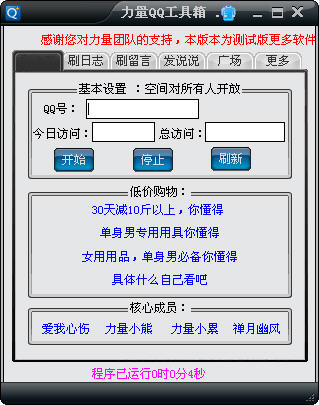力量QQ工具箱是一款包含了QQ刷空间访客、刷QQ空间留言等工具为一体的工具箱。