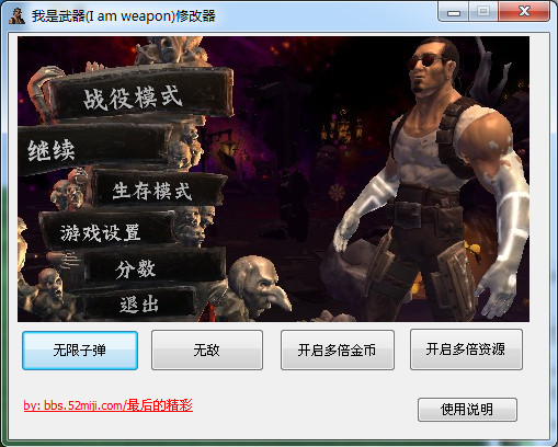 我是武器修改器可以修改游戏中的四项作弊功能,可以更好的辅助玩家进行游戏的通关 功能介绍 无限子弹 无敌 开启多倍金币 开启多倍资源