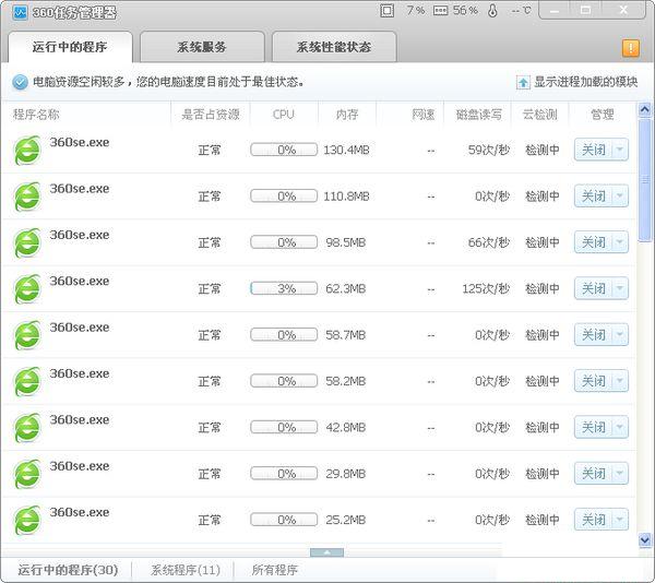 360任务管理器提取自360安全卫士,启动后,在“系统性能状态”标签中,可以看到cpu使用率和温度、内存、网速几项重要数据。