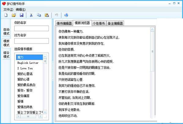 梦幻情书助手 V4.0 绿色版 梦幻情书助手(情书自动生成工具)是一款专门写情书的免费软件,有了她,你不必再为写情书而烦恼。 她可以由电脑全自动生成(有上千种不同的情书模板,每种都文辞华丽、情意绵绵,保证你的女朋友看了心欢),也可通过填写一些资料生成你独特的有个性的情书。